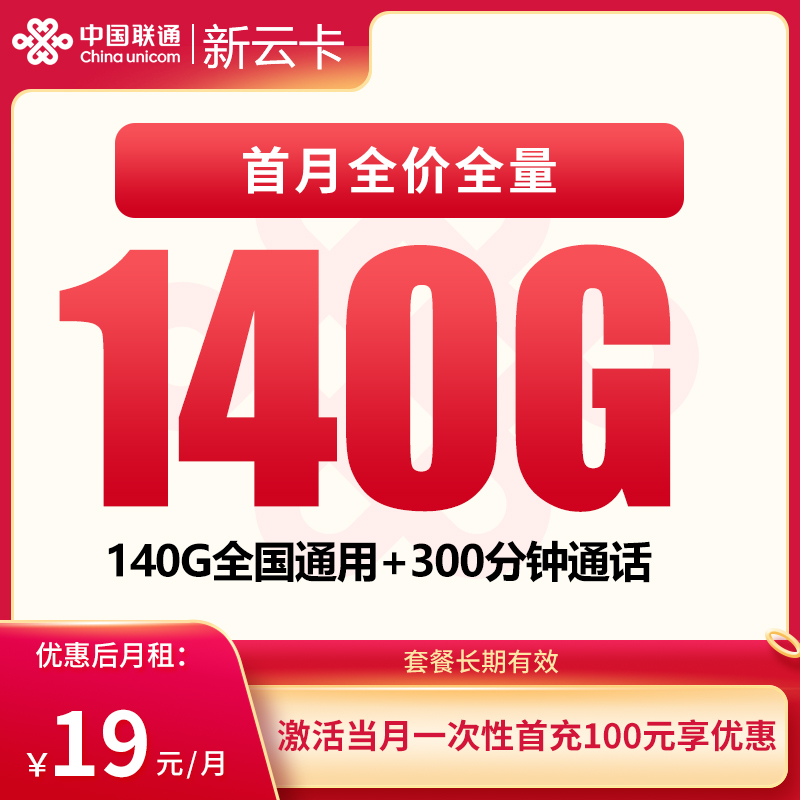 号易联通新云卡19元,套餐包含140G通用流量+300分钟通话。,首充100元享优惠,有效期36个月,京东配送,激活方式自主激活,办理年龄18-65周岁,支持5G,流量结转,联通官方授权,号易分销系统提供。