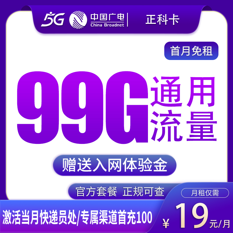 号易广电正科卡19元,套餐包含99+0。,首月免费,首充100元享优惠,有效期24个月,激活方式上门激活,办理年龄18-65周岁,支持5G,流量结转,广电官方授权,号易分销系统提供。